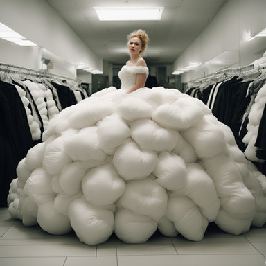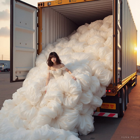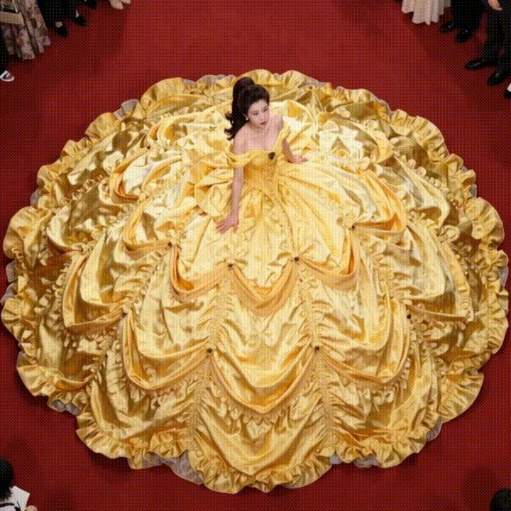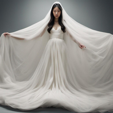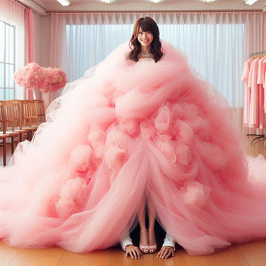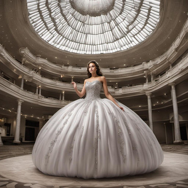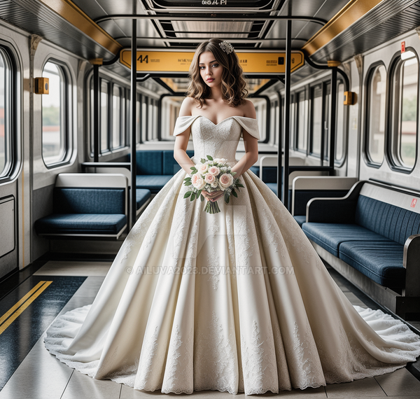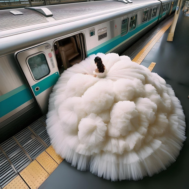 A young lady is present in the train cabin, her expansive dress surrounding her. The tail of her dress trails behind her, blanketing the cabin floor. In an unusual setup, she has the luxury of having the entire train cabin to herself. Although the cabin is designed to accommodate hundreds of passengers, it now only houses one girl and her extravagant dress. To put it accurately, the girl is just like any other person; itβs her massive dress that fills up the entire train cabin, demonstrating its impressive size.--------------------------------------------------