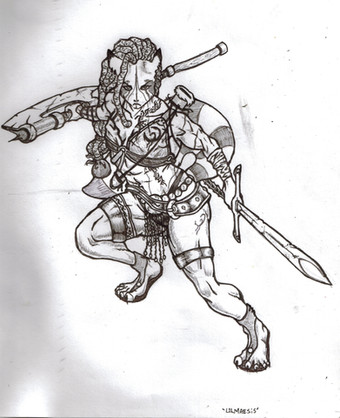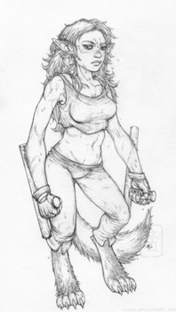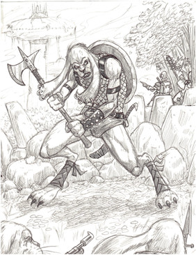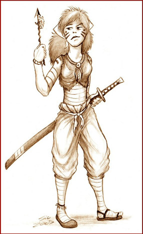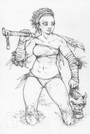 Shank is an attempt to depict a true female Conan-type warrior without resorting to too many fantasy tropes. She comes from a humanoid species genetically created for survival and pragmatism in harsh climates and violent times - these are not a creative or enterprising people, few of them know how to work metal and it is a scarcity besides; fur, leather and whalebone suit their purpose.