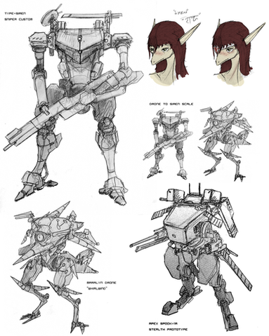 I've been trying since 2009 to try and come up with a perfect design for the TYPE-SIREN. These are just some of the random assorted drawings of it. I have the basic shape down, but not the fine details...