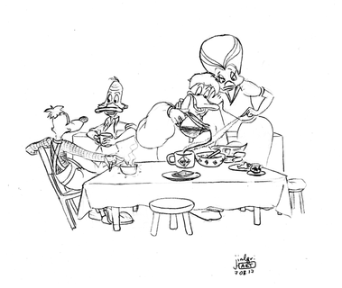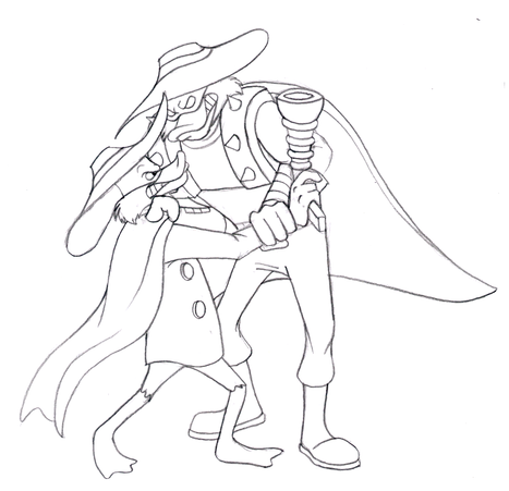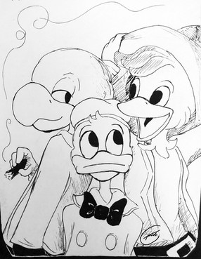 Launchpad is trying to get his buddy Drake Mallard a job at Scrooge McDuck's money bin, sort of like, a filer or secretary or something. Obviously Scrooge is very angry for some reason, probably giving them both a warning screw this up and your both fired' I just really wanted to draw a rumpy Scrooge poking his cane at Drake XD