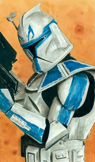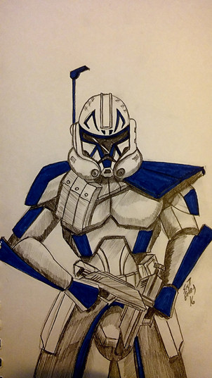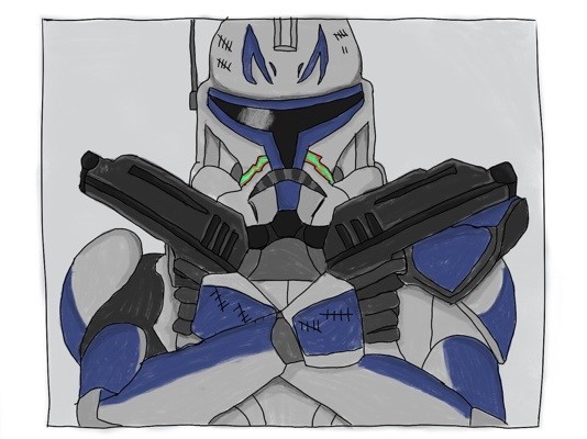 Captain REeeeeeeeeeeeeeeex!!!Call me slow, but this took me a whole week, and the guns still suck and I used "how to draw Star Wars" for help, because I suck that much. Aaaand the bottom half is completely out of preportion, and the helmets wonky. Aaand the background is full of naffige.
