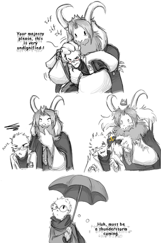 And now Asgore has to deal with a scared Gaster. Thank you very much, Toriel. It's amazing, how Gaster doesn't run away screaming from Toriel, at this point.