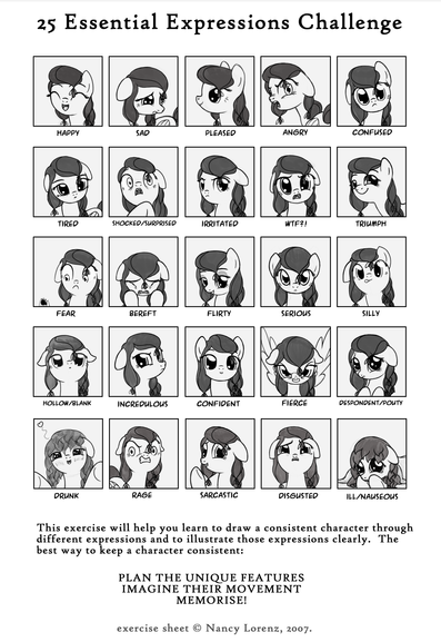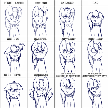 Expression sheet for Kazziepones of her ponysona, Hazel!Kaz has had me working away at other things of late, so this took longer than I wanted and wound up only being a half sheet, but that's fine! I needed an example of that sort of thing anyway, as I'm planning to charge for these by row.