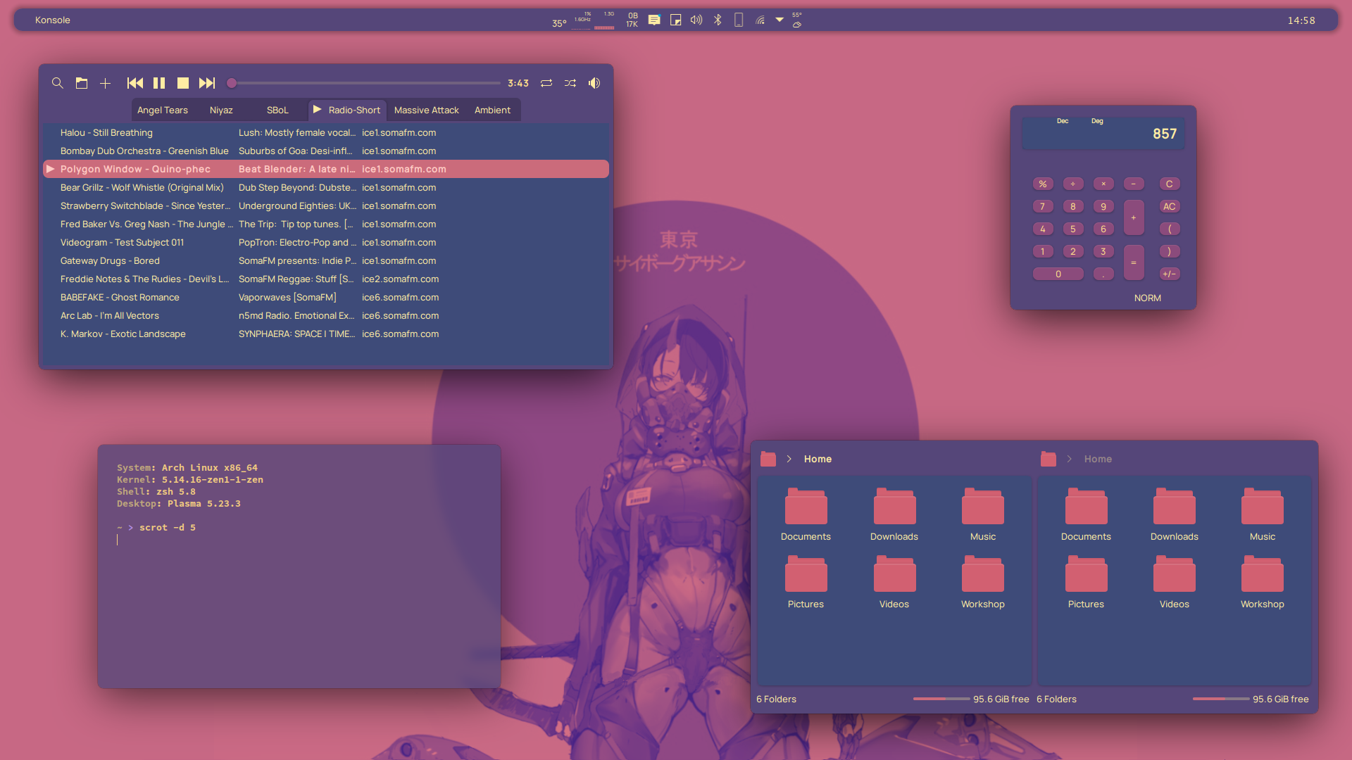 I have been a bit quiet with themes lately,this was due to a serious bug in the Plasma 5.26 update,it would cause the entire desktop to freeze continually,all I could do was use REISUB to reboot,so it was basically unusable,but hopefully it has been fixed now in an update,so fingers crossed!The 5.26 update also broke LightlyShaders which I used for the rounded corners on the windows,but that turned out well as I discovered the SierraBreezeEnhanced window decoration,which has much better options and no graphical glitches.