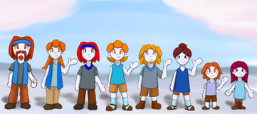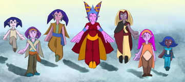 Their skin hues range between reds, magenta, pink and red-orange, occasionally with light color freckles. Their hair color range between red and orange. With age, their hair darkens to black. Their eyes tint in reds and oranges, with rare yellows. Their sclera are black.