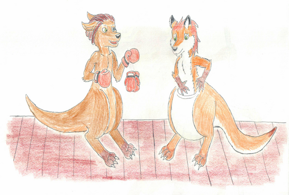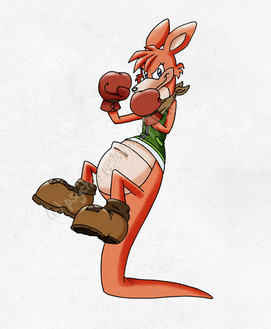 Ripper Roo is copyright of Crash Bandicoot by Activism. Ruby Roo, his sister, is my OC. Since he's going to feature in a future story, I thought I needed some practice drawing him and Ruby tagged along to keep him out of trouble.In this "what if" scenario, Ripper is born into a world without Dr. Neo Cortex to subject him to endless experimentation that would eventually turn his fur dark blue. No spindly body wrapped in a straight jacket for this boy. This is Ripper as he would have been. A healthy red male kangaroo who still has a penchant for wild explosive adventures. His best mate is a feisty bandicoot you might know. As a nod to his original self, I've designed him with blue shorts and a dark blue bandana. Of course Ripper's wild side is somewhat halted by his strict sister, Ruby. As a trained medical professional, she makes sure Ripper gets his check-ups one way or another. She's no slouch in the muscle department either and not one to be crossed.
