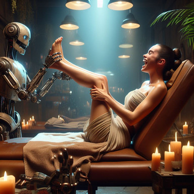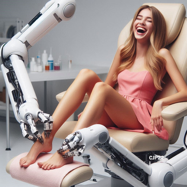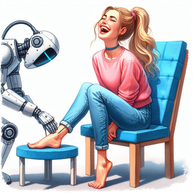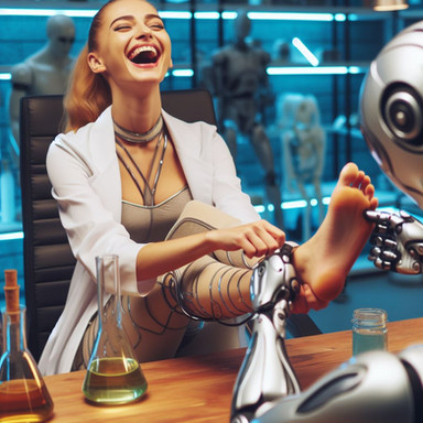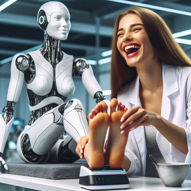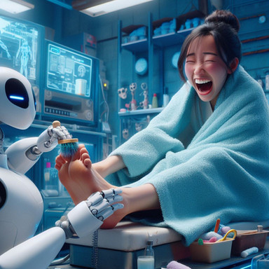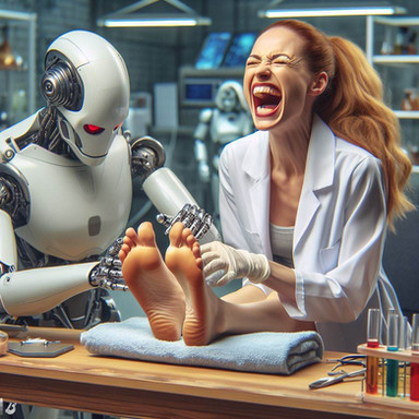 The Stride-Right Scanner had been in usage for only a week, but it had already resulted in a leap in objective force and plantar pressure analysis. What this meant to the layperson was no more uncomfortable or painful shoes. After a scan completed by a robot representative, what shoes you bought always fit right and corrected a potential host of issues, guaranteed for a three month window post-scan. Scores of women descended on FitFoot stores and always walked away smiling.Unfortunately for Emily, what they didn’t advertise was that the device absolutely tickled to high heaven. She was already born with the delicate lasting curse of ticklishness and it seemed to prey on her every sensitive nerve endings. Finally, after multiple failed attempts to hold still, exhausted and embarrassed she got through the process and received her perfect shoes.
