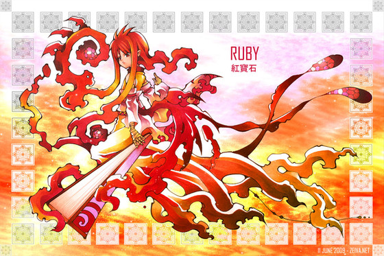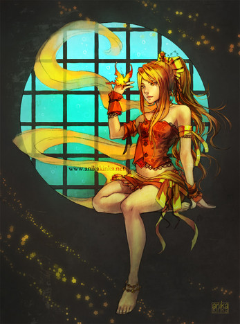 Wow... I love her dress! It reminds me of flames of some sort of bonfire, also the Japanese insipred incense container really adds to the overall mood.