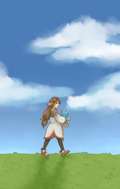I like the painty style, it's mellow and relaxing. The character's hair is beautiful too. It kind of looks like there's some fog/mist in the air too. Really nice job! ^^