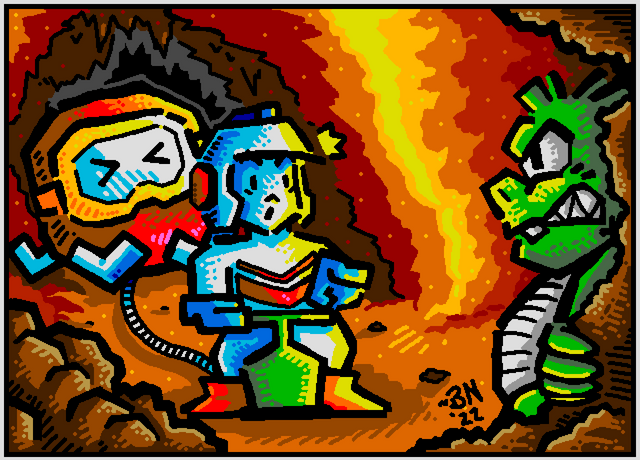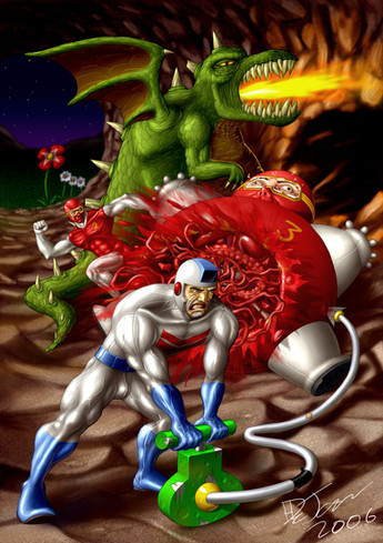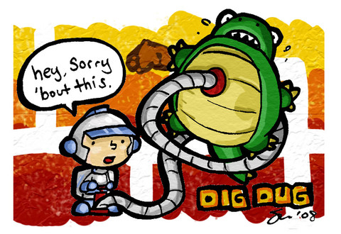 This was a badge for Marscon 2008... picking my favorite games was fun. Dig-Dug kept me busy for days when I was a kid.pencils on paper, inked and colored in photoshop
