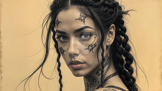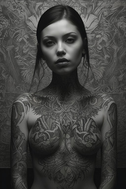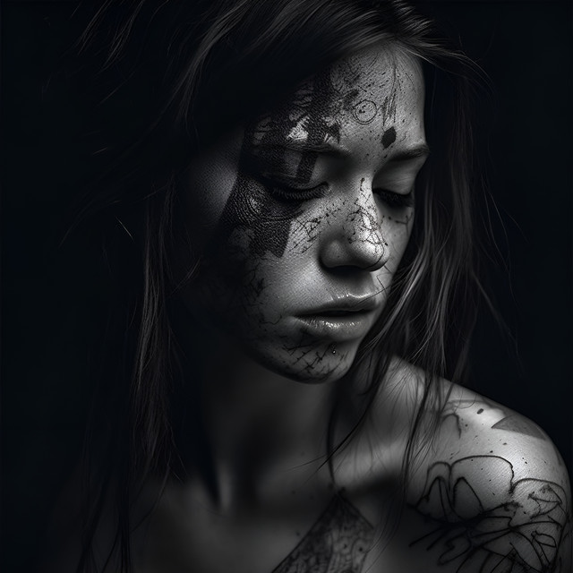 #duality #emotional #grayscale #introspective #portrait #profile #realism #serene #tattoo #woman #dreamup #art #zenitaris
