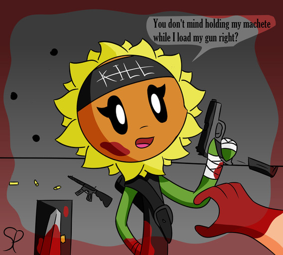 Blandozo The Mask: Yeah no worry's, excuse me for a sec I gotta take care of him for a bit. (grab zombie, pull out and punch him a lot) I WAS TALKING TO A NICE SUNFLOWER LADY YOU STUPID BRAINLESS HUNGRY ZOMBIE! Heyah! (punch zombie up the top floor and dead) There that will learned him, (he look at his right hand on the bite mark) say uh can do me a favor, can you cut my right hand before I turned into one of them.