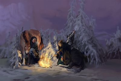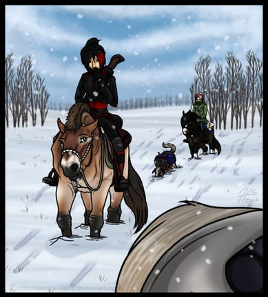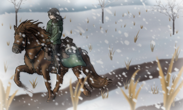 Kimberly had not seen anyone for about 4 hours now, she started to panick a little bit. She was starting to get terribly cold and the map wasn't helping a lot either. Punk was starting to get impatient because she didn't want him to move while looking at the map. Then he turned his head and he started neighing. Someone was closing up on them