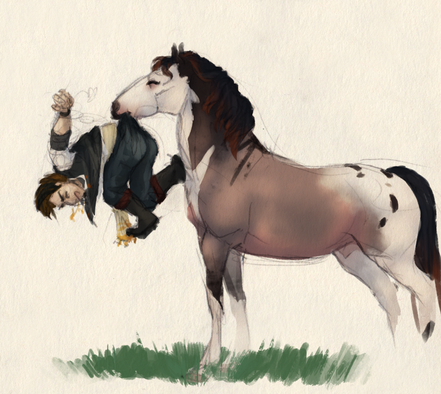 But before he gave her any more carrots, he walked away, holding them seeable in his hands. His plan started working. She followed him. Fooood, foood. She noticed too late that she was locked in some pasture. At first she bucked around like mad but calmed down when she spotted the dry hay Riley brought. She eyed it suspiciously but her hunger grew too big and started eating. Riley watched her. There he didn't know yet that the pasture's door wasn't locked for a clever mare like Xena...