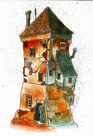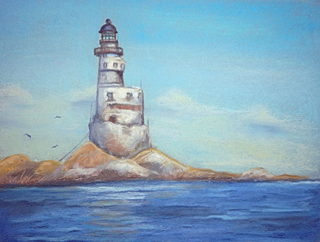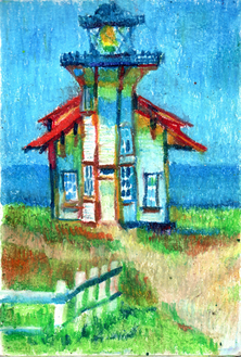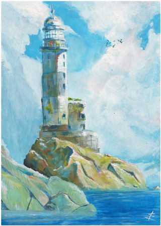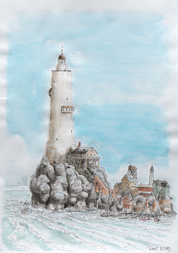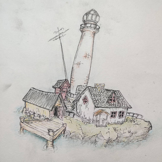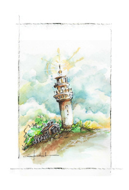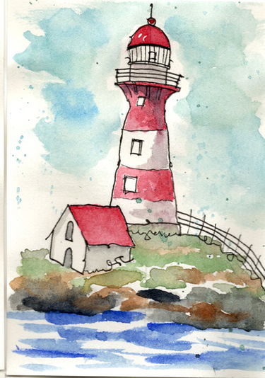 #aquarelle #architecture #bricks #cliff #clouds #coast #cracks #fence #grass #ink #landscape #lighthouse #ocean #painting #rustic #sea #sky #watercolor #old