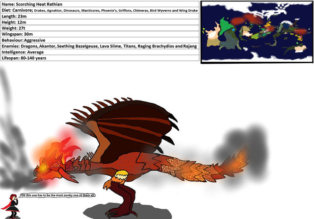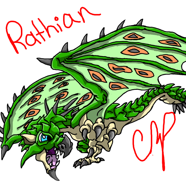 Intro: A slight offshoot of the normal Rathian the Conflagration Rathian is a lot more durable and has noticeable red spikes almost like a poisonous plant.Habitat Range: The most commonly found in open planes and forests, though they might occasionally appear in ruins.