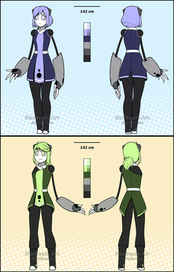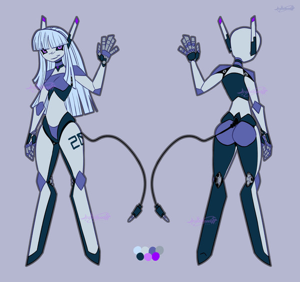 Character ref sheet! For cheekythalia featuring Gidget, an android vortian who has a lovely organic disguise. I got to design a nice outfit for her and she was very fun to draw <33