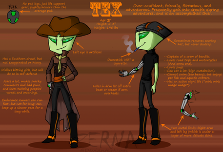 Nuic attended the Invader's Academy in his teen years along with Tex. He was one of those students who got perfect scores in every class. The teachers liked him, the students liked him. A certain event in his first year at the Academy, however, kept his ego from getting overinflated. He was promoted to a sort of teacher's aid in various classes after he had been in the academy for 2 irken years for his maturity and quickness to learn. He took part in organizing school events, training opportunities, etc. Only in the simulated battles was he starting to lag behind---he could shoot the targets just fine, but he wasn't good at doing the dirty, killing jobs that was expected of soldiers...taking innocent lives, or killing enemies who didn't come off as evil. In this, the academy saw a shortcoming, but he was good enough at everything else for them to overlook this, for now. Despite this, he recognized his own self-worth, and liked to think of himself as near-perfect...even going out of his way to be well-mannered at all times, to a point that it was weird to the rest of surrounding society, like he was some uppity, snobbish royal.