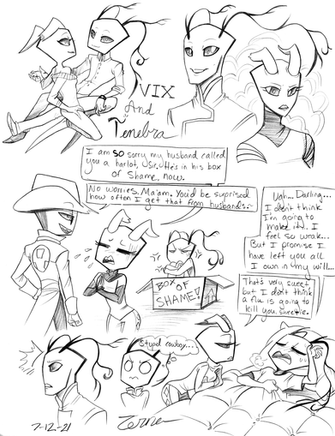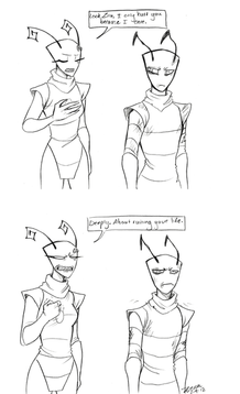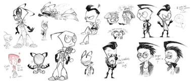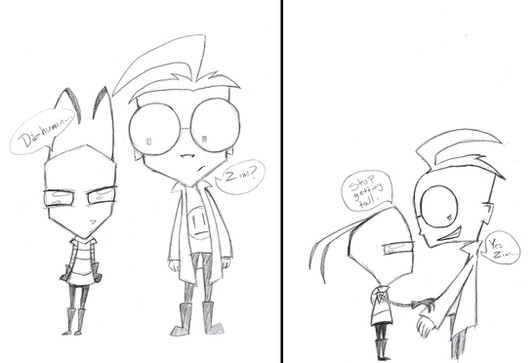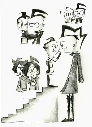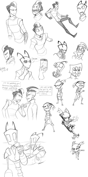 I was randomly inspired to draw some canon characters when I was in a long-awaited drawing mood. I went a little crazy with them, having a surprising amount of fun. Normally, I'm impartial to ZADR, but...well, that's random inspiration for you.My fav doodle is of Zim in his disguise looking worried. .D.