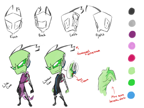 During his younger years (between birth and 10 years of age) Zeith attended the usual military schooling provided to all Irken smeets, and proved to have very promising technical skills from the time he was allowed to wield wires and metal. By the time he was ten years old, his genius for technology became apparent, as well as his slowly inflating ego at his instructor's praise and talk of his heightened intelligence. True, he didn't have much skill at anything else, but he was still placed in a high-end school expressly for technicians of the Irken Empire. This school was known for inserting certain wires and electrical devices into their students so that they could absorb and create electrical pulses and shocks without electrocuting themselves--useful for jumpstarting machinery and staying safe. Zeith's antennae were clipped and given artificial floating tips to aid in the conduct of electricity.