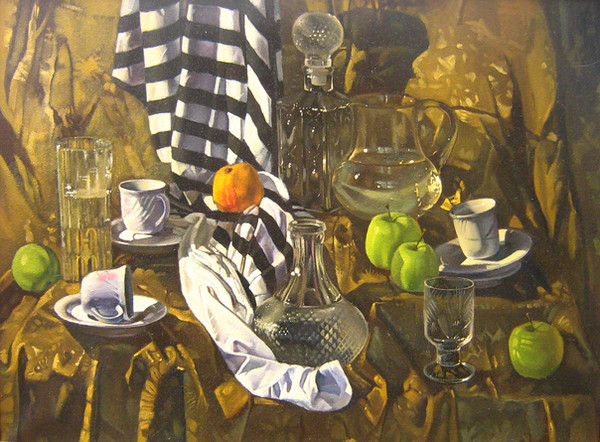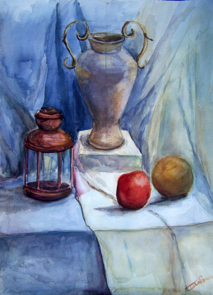 There's something very nice about this piece. I really like the colors, even the blue looks warm accompanied by the goldish shades. I think this is good technique-wise too, especially the vase. Folds are done very nicely too. Just the apple looks a little odd, two-dimensional and the peel doesn't look natural.