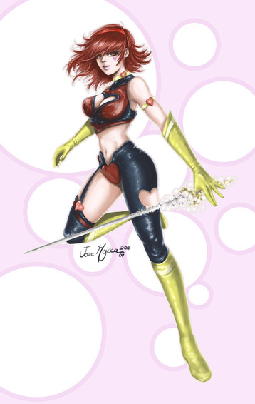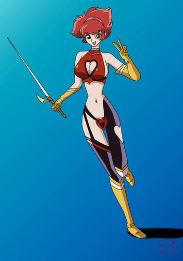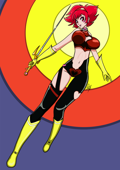 Never thought I'd like this. Here's Cutie Honey in her latest incarnation, based on the recently (or not so recently) released OAV, Re: Cutie Honey. At first I thought the show was totally exploitative, and I still do, but its almost psychadelic style makes it stand out. And of course, I really like the jazzy bits of thereworked theme song by Koda Kumi (of Real Emotion fame). Retro, yet contemporary at the same time.Pencils and inks on paper, colours in Photoshop 5.5. I got her sword wrong, but all I had to go on was a relatively inconsistent anime and a 4-inch tall gashapon figure. Sorry!