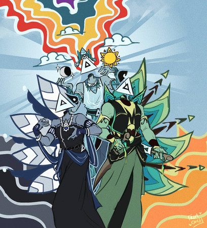 Some random, very random characters. I consider them "deities" just because they have that aspect. I don't know if I'll include them in my universe - actually, I haven't decided yet about religion in my universe... along with a lot of other stuff. =3=And I don't think I can manage a brand new pantheon, actually. So maybe they'll fall into oblivion and no one will ever see them again.