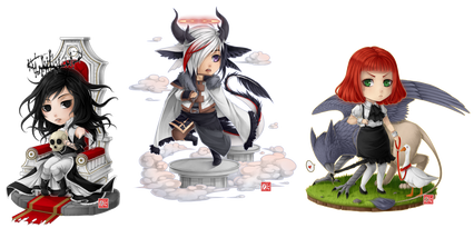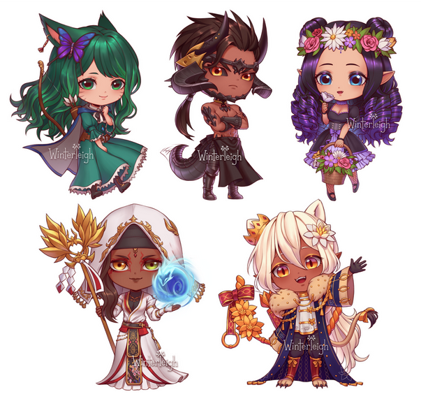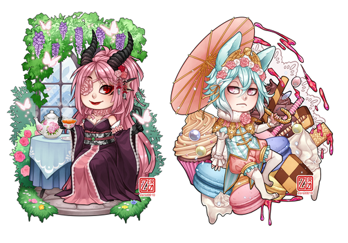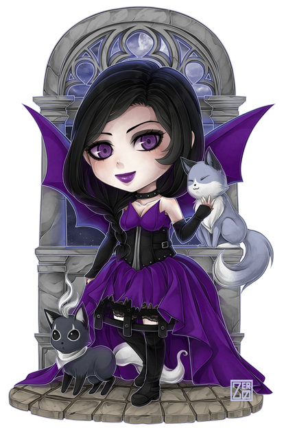 Since a Patreon Reward chibi costs a little more compared to a normal commission, I allowed myself to experiment a little, adding some extra stuff. I kinda like that circular "background" behind Xyraya. That floating green leaves, on the other hand... what the hell are they even doing there? I added them to recall Roxie's eyes, but... they look just so random ._.