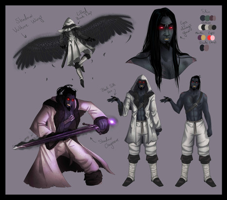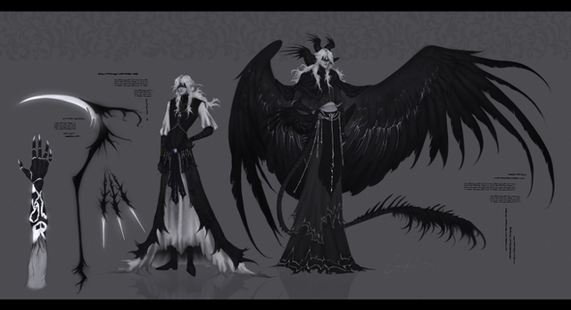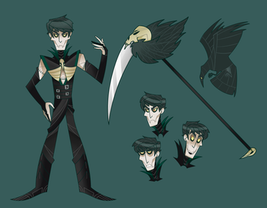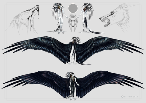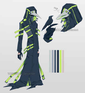 I really like your character designs, they're so balanced (in my view) in regard of colours. This one's blueish hair + black outfit combine awesomly with his pale skin + red eyes I specially like the tatoos (do they have any meaning, besides them being subcutaneous shadows or they serve any purpose?) and the details of the scythes. Also, it's a nice touch the bird mask to go with the feathery wings. The outfit is really detailed and the mask is really cool (although I wonder how he gets to breathe, as it seems made of leather and metal).