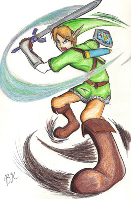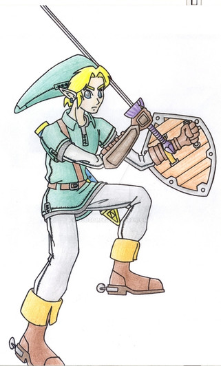 Nice work! You've got some nice detail going - I particularly like the way you've drawn in the scabbard, with all the straps, and the smoke rising off Link's sword. However, my main nitpick would be (even though you're using copic markers, and I know how difficult they can be to control) the colouring, because it's very choppy, and not particularly clean edged, which I think cell shading generally has to be . And while there's a nice build of midtones and shadow, there's a severe lack of highlights. The metals in particular - except for the sword blade - cry out for some more shadowing too, particularly the buckles. Is the triforce on the glove supposed to uncoloured? Also, the whole image is a bit dirty - upping the levels a bit more makes it a lot more cleaner looking, and probably closer to what it looks like on paper. (Yes, I tried