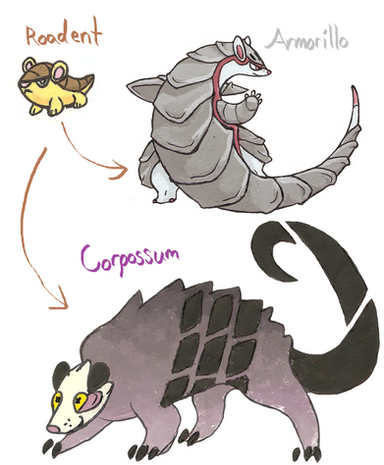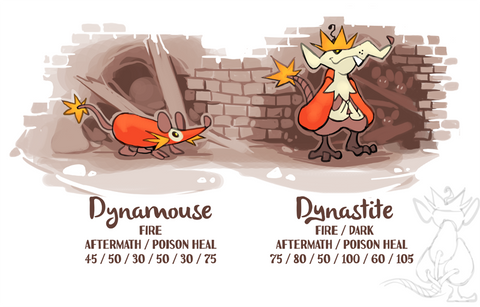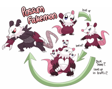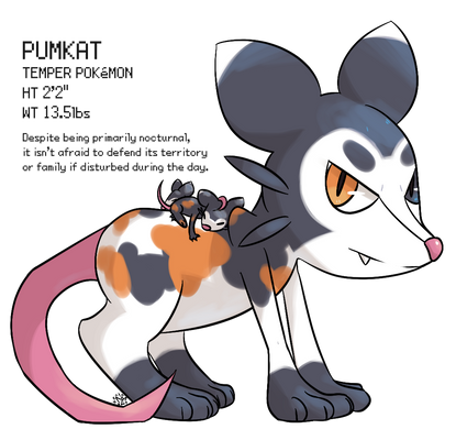 And of course, we don't yet have an opossum pokemon! That was the main thing I approached this design with, i wanted to make a trashkin pokemon, either a raccoon, rat, or opossum, and i ended up landing somewhere between rat and opossum. Also I love when pokemon evolve from one species of animal into another, so the idea of an opossum turning into a kangaroo because they are both marsupials is fun to me!
