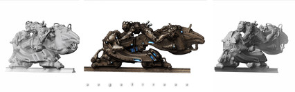 The heroine narrowly escapes the Octobots on her seahorse bike.A sci-fi underwater scene sculpted in ZBrush, rendered in Keyshot.