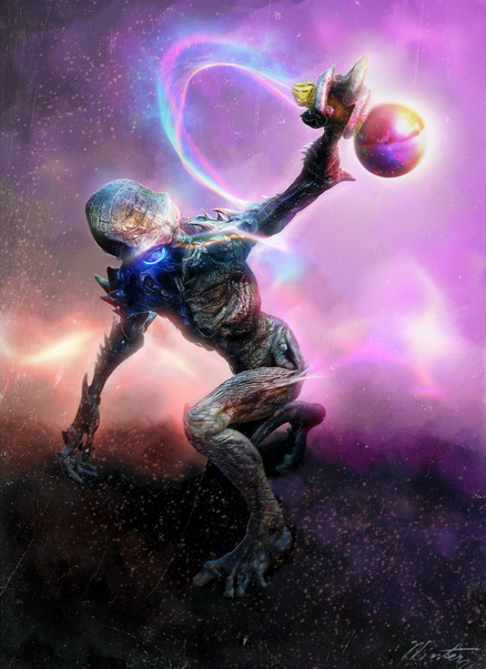 An alien elder observes his navigational device in search of ancient artefacts.3D sculpting done in zbrush, painting in photoshop.
