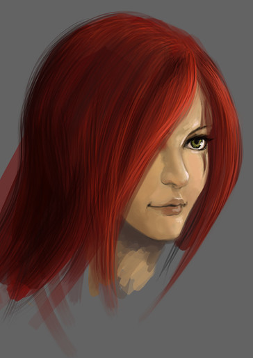 This certainly is one of the best portraits I've ever seen. Wonderful job on the colors, and the use of highlights and shadows. I particularly like that slightly glowing highlight in the hair. For the hair itself, I think you are certainly right saying that leaving it at this stage gives it a painterly and stylish look. There's something about it that makes it look great, maybe the combination of accuracy in the upper parts in contrast to the painterly parts in lower parts. It's a simple portrait but I love everything about it. Good job on the eyes as well, the sleepy eyes look great, as someone else has already said. They add something mysterious and erotic to it, in my opinion. The only thing that's a bit off for me is her upper lip. I don't know, to me, it goes just a bit too much into a kiss-position, because it's sort of pulled-up. If that was your intention, good job there as well, it was just something I noticed.