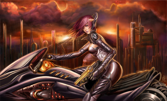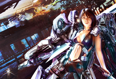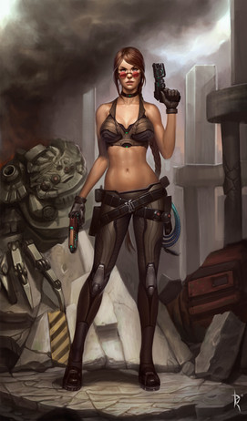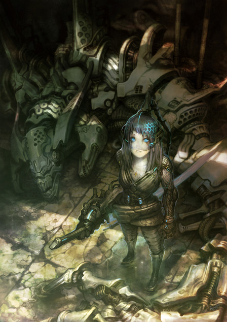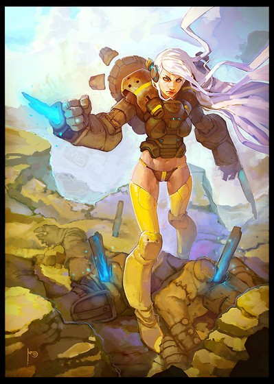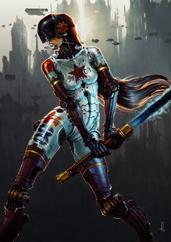 Wow, I really like the way the bot both stands out and blends in and her bionic arm. Is she somehow related to the robot in the background, like she controls him or something along those lines?