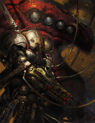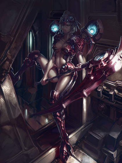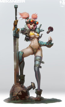 I'm as interested as anything in the construct beside her. Were you going for steampunk or mecha or both?