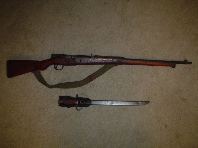 2 of these guns I bought today. The top one is the Mosin Nagant M1891 Long Rifle the middle one is the chopped down late war Arisaka I bought yesterday and the last one is the early war Arisaka with a bayonet that I bought today.Related content