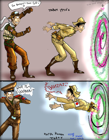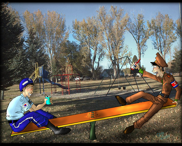 Eah something I doodled while all that North Korean nuke scare was going on. Its no where near politicaly correct lol but the image looked silly in my mind. The Chinese guard is named is Ten, he's mean to NK. haha SK sounds corny he goes "holy cow" XDRelated content
