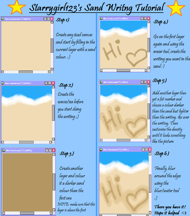 A first try at posting a tutorial. It's a real easy version of making sand, mostly with the burn and smudge tool. If you try it, send me a link, I'd love to check it out!Update: These are the awesome artists that have shared their creations with me. Thank you!