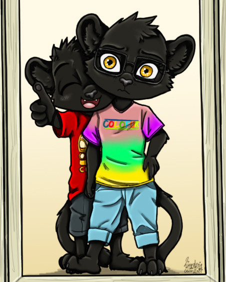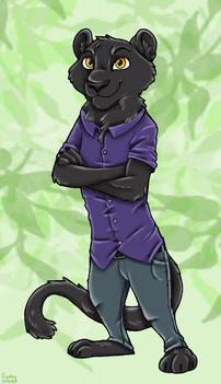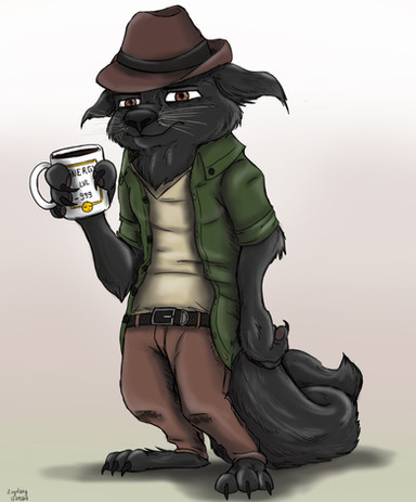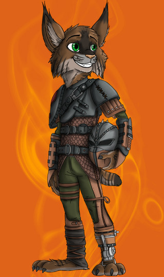 J'aime bien son style avec son... ehhh... foulard? Cache-gueule? M'enfin bref. Autant tu réussi à rendre les canidés très expressif, autant tu le réussi avec les félidés aussi ^^