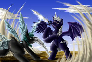 Truthfully i would want both to stand down and plot together to take down all of equestria. i do not ship them but with these 2 powerful villains they could surely take anyone on! if i had to choose one it would be sombra because i am his loyal and adoring slave ^^