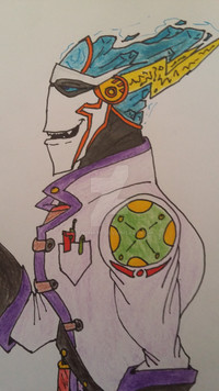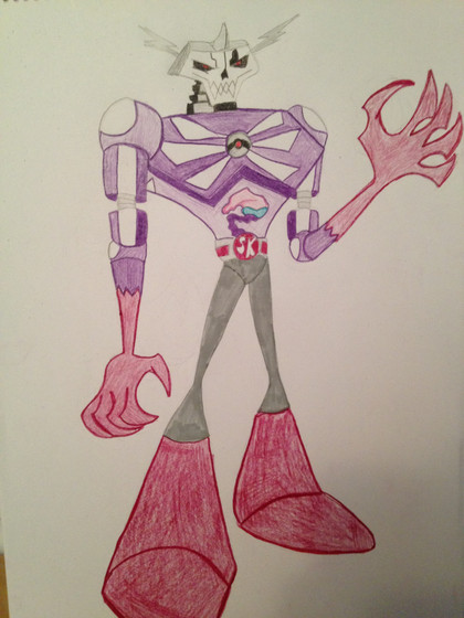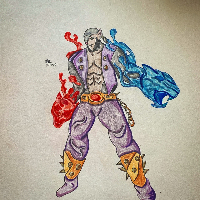 I think that is a perfect name for him so he has a mechanical arm and an arm made out of magical energy and stones with the magic symbols running along his body! With awesome flaming purple hair! What are his powers?