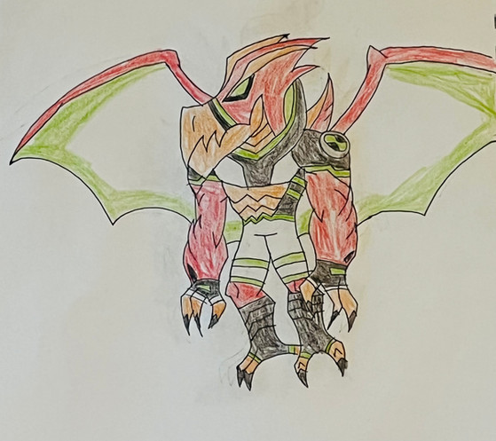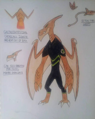 Additional info: Astrodactyl has hardened fire proof scale on his hands, forearms, chest, and the "jet shell" on his back to protect his body from from the hear of blasts and jet flames.