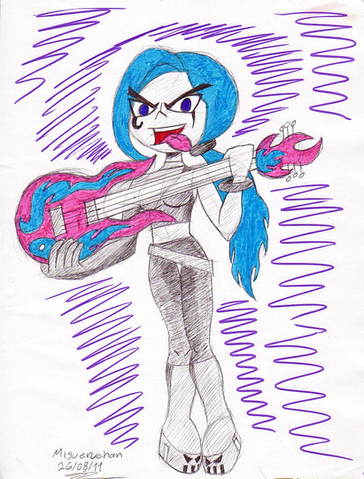 For her new look I decided to give her a new heavy metal look which I got inspiration by from Brutal Legend and Metalocalypse. For her had I made it spike up to give it a fiery look because here all of her hair turns to flames instead of just her ponytail. I thought a corset would be a good look for a modern female rock star and the green straps she has turns into green flaming whips. Her boots are now mostly black to make skull motif more noticeable. Finally her guitar has been slightly changed so now it has a bit of a dragon theme and doubles as an axe.