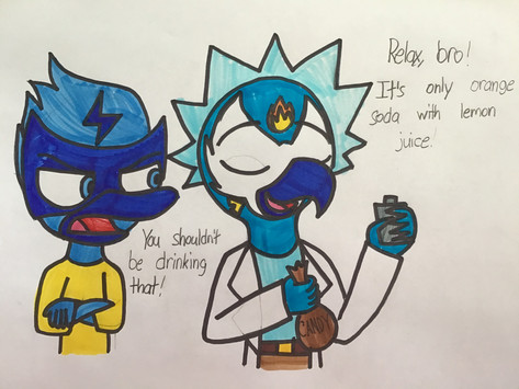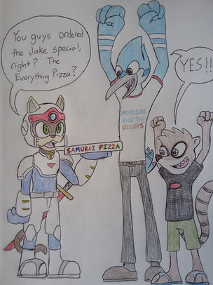 After made his alien Rigoon [link] , I felt like it would be cool to do this since his alien is based on Rigby from Regular Show, I would make one based on Mordecai. I also threw in some features from Falco Lombardi. And as for the joke, I don't usually put dialogue in my drawing, but I thought that this would be funny to include a reason why we always see characters posing to us. And who better to tell us why then his little buddy, Rigoon.Name:Featherweight