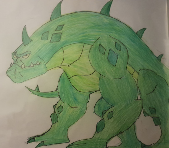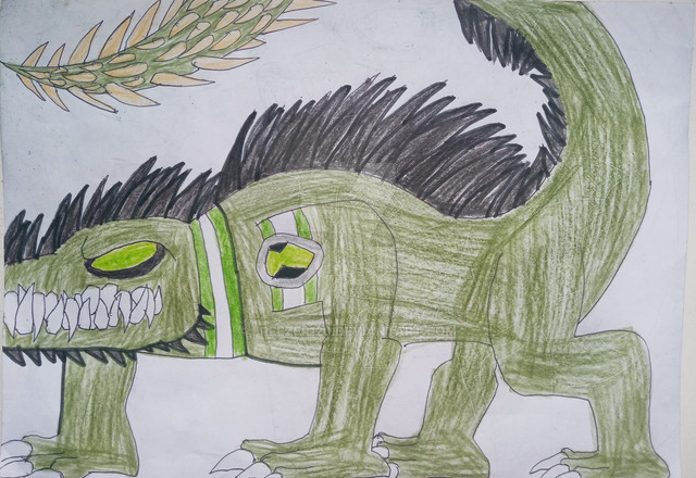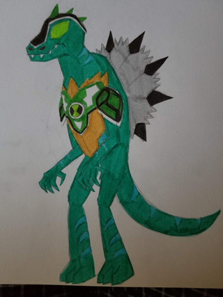 Cool design, though now this just makes me want to see more kaiju style aliens. Personally, I think using King Ghidorah would be good since we already have a turtle in Terraspin and an ankylosaurus in Albedo's Ultimate Humungousaur. How about Golden Bolt? He's gold in colour and shoots out lightning so it fits. It's pretty lame but better than Hell Hydra! His powers would be the obvious super strength, speed and durability that comes with his massive size and flight. He would also be able to survive in space and shoot electromagnetic lightning bolts. These would allow him to not only cause massive damage but also be able to pull things towards him or make them float (King Ghidorah has gravity beams). He could also use these as EMPs to disable passing space ships. I imagine he would be less of a predator but more so a rival to Gigantiguana, a competitor for dominance and prey. He would also be a big enemy of the To'kustars of course.Β