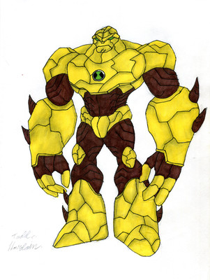 My version of the lesser known Ben 10 alien, Rocks.I decided to make his design a little more interesting than the boring yellow green rock humanoid that he originally is. Here he's made of golden sand fused together into boulders, solid rock for his fingers, toes, face, and arm stalagmites, and his limbs, neck, and lower torso are made of layers of compacted dirt. Alot of inspiration for this design comes from 's version of Rocks redamimi.deviantart.com/art/Be…