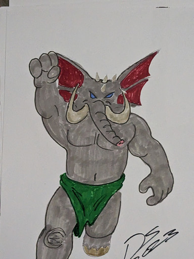 For his look he was only able to make due with what he could find for a hybrid of his size, now being 9 feet tall and 450 pounds. His shirt is full size mattress sheet, his lab coat was the one he had back when he was human but because of his growth, it clings to him more than before, his shorts are elastic ones a heavy weight boxer would wear and he's got a weight training belt to keep his outfit together. Tembo has to make his own glasses in order to see and even made his own wristwatch which is actually a full sized wall clock and finally Tembo is missing half of his left tusk because predator hybrids were trying to cut it off to sell on the black market.