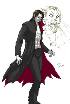 At age 35, Michael had heard of a colleague of his Curt Connors, transforming into the reptilian mutant known as the Lizard and almost turning all of New York into lizard mutants as well until Spider-Man stopped him. Michael had been in contact with Connors over the past few months and too interest in his cross species mutation as a potential cure for himself and Milo. After the Lizard incident, all of Connors' research was taken by OsCorp, including the Decay Rate Formula that made cross species possible. Luckily Milo had an insider at OsCorp that sent the formula over to Milo and Michael over at Horizon Labs. Taking DNA from vampire bats and modifying the formula, Michael, Milo and Martine Bancroft developed a new treatment and secretly administered it to Michael, after he started to take a turn for the worse health wise. Michael seemed to make a miraculous turn in his health, his blood disease was gone and his body became as physically fit as an olympic athlete. The trio spent three days studying Michael's condition and all seemed to go fine until Michael gained a hunger and no food could stop it. Michael blacked out and woke up in mob warehouse with everyone dead inside and blood all over his mouth.