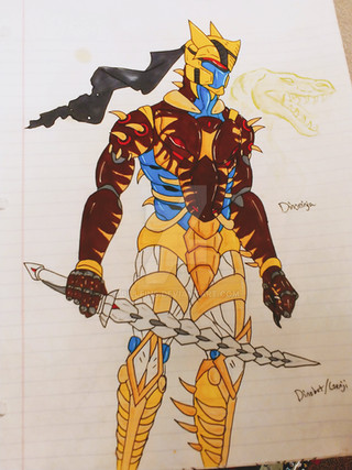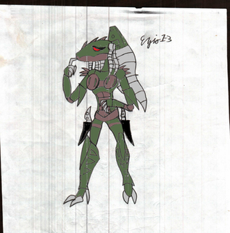 One of Ritari's generals and mate to Goldarr.Skorpinaxia is an Araxtingair from planet Stinjrotto. Growing up there is as tough as a life can be. Stonjrotto is a desert planet with four suns and very small sources of water to draw from. Skorpinaxia was born into this world alone and nothing was given to her or made easy. She had to fight for what she could gain from bandits and thieves. All of this conflict forged her into a great warrior, but it also did cost her an arm (though luckily this grew back in 5 Earth months). Skorpinaxia's life would change on the day she decided to challenge the bandit king, Arxterok. She slew the king in his arena and claimed his sword, Zcorpifin, for herself. It was then that Ritari Pulsa's forces descended upon the planet. Ritari planned to have Arxterok be one of her generals, but now that he was dead, there was an empty spot that needed to be filled. Ritari offered this position to Skorpinaxia and offered her more than a world of neverending sand and heat and Skorpinaxia accpeted. She was one of Ritari's best generals with her ferocity and it was that very thing that earned her the attention of her fellow general, Goldarr. They fought side by side and admiration turned into infatuation and the two started a romance.